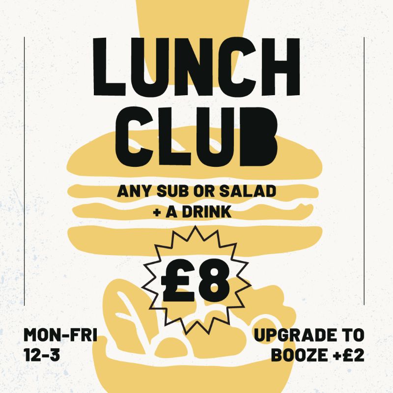 Weekday lunch sorted - enjoy one of our filled subs and a drink for just £8. +£2 to upgrade to a booze